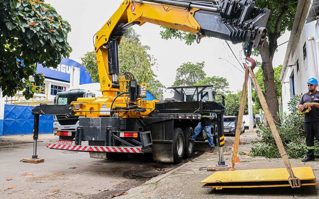 - Auxilia na instalação de postes e rede elétrica.